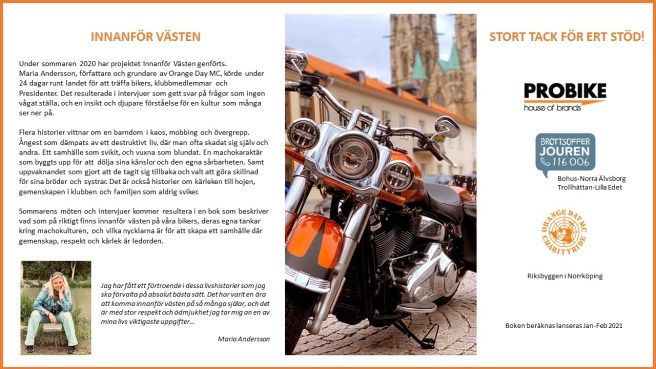 Maria Andersson, författare och grundare av Orange Day MC, körde under 24 dagar runt landet för att träffa bikers, klubbmedlemmar och Presidenter. Det resulterade i intervjuer som gett svar på frågor som ingen vågat ställa, och en insikt och djupare förståelse för en kultur som många ser ner på.