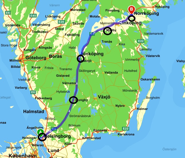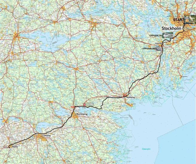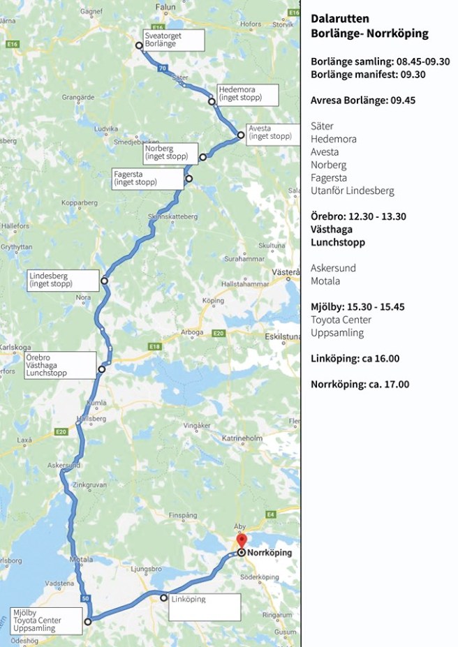 Rutten är beräknad på en hastighet på ca 90 km/h. Viktigt att vi inte överskrider hastigheten av säkerhetsskäl. Vid stoppen samlas de som kommer från övriga Sverige och som inte åker ända från Helsingborg. Här finns möjlighet att träffas innan och invänta kortegen. Toyota – Mjölby är sista anhalten och stoppet innan slutdestination Norrköping, där människor som kommer uppifrån landet samlas. Var ute i god tid då detta är cirka start tider!